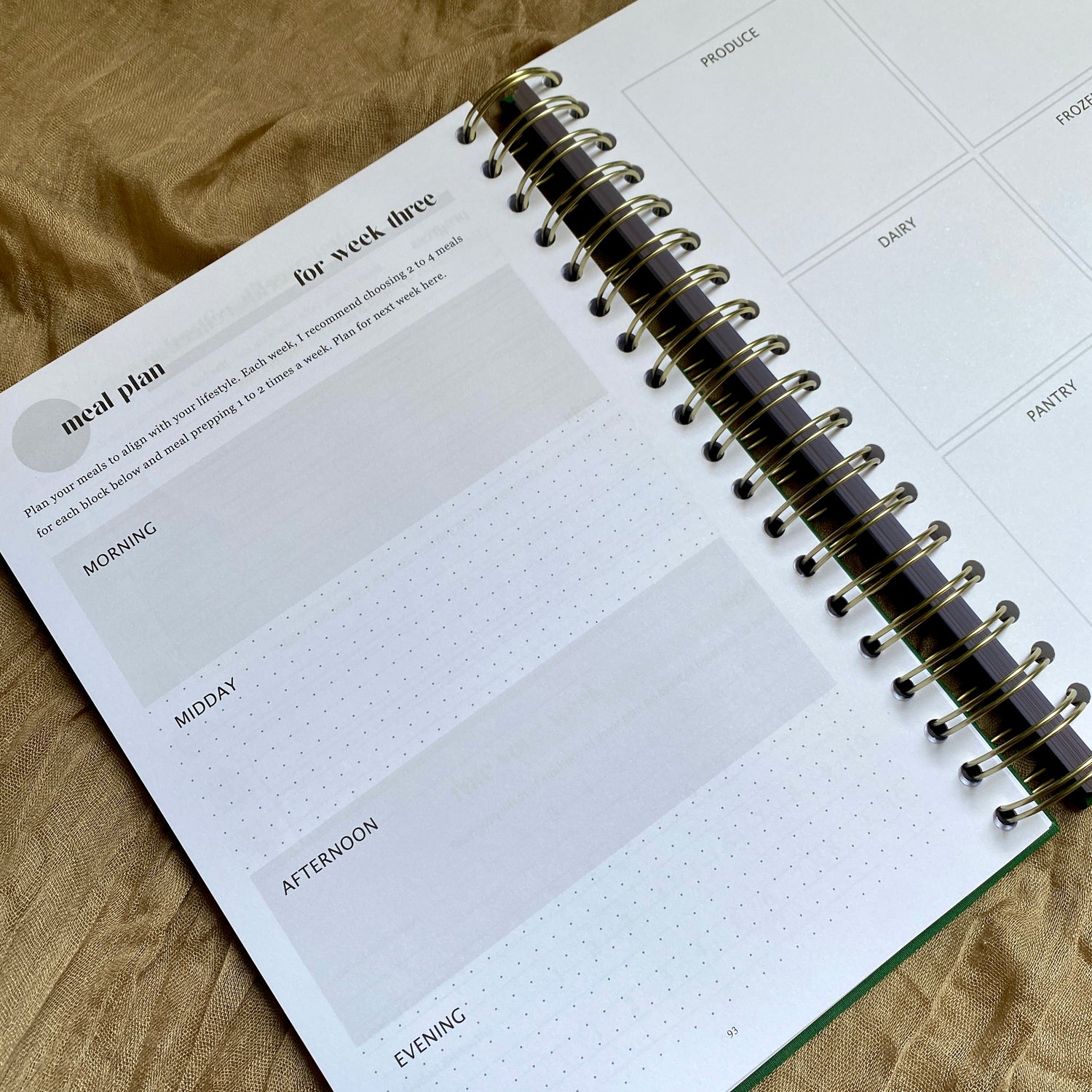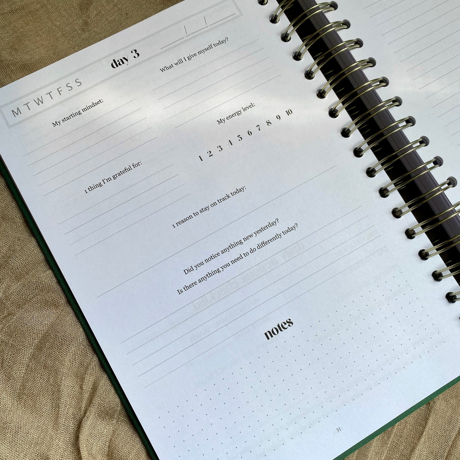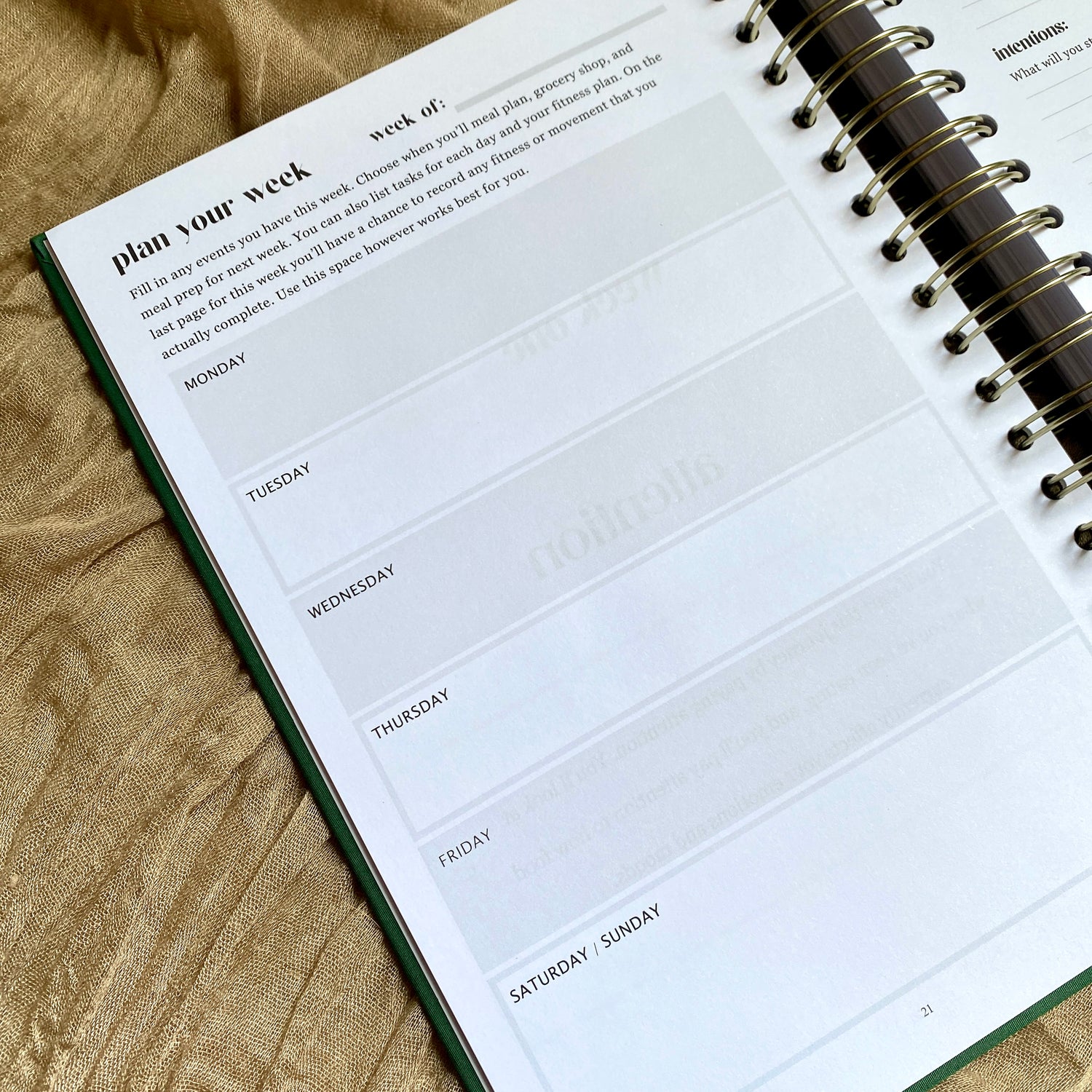 Each week includes space for you to include your plans and schedule. You'll also have space to center yourself and prep your mindset for the week. You'll list your goals, intentions, and your thoughts & feelings.
